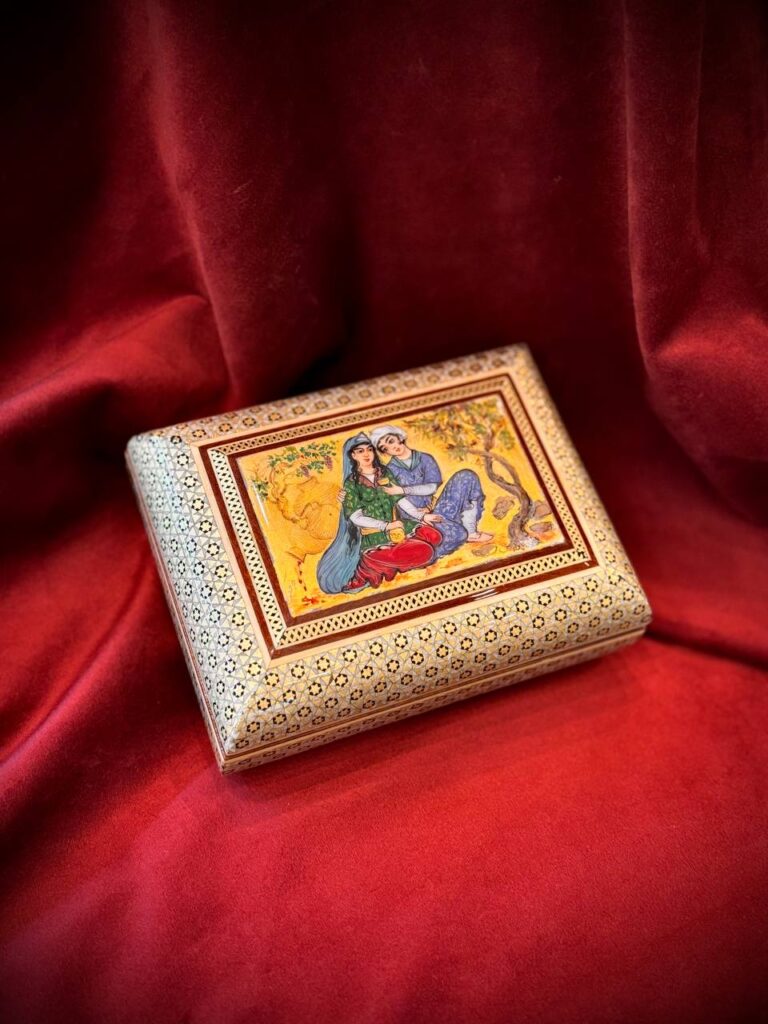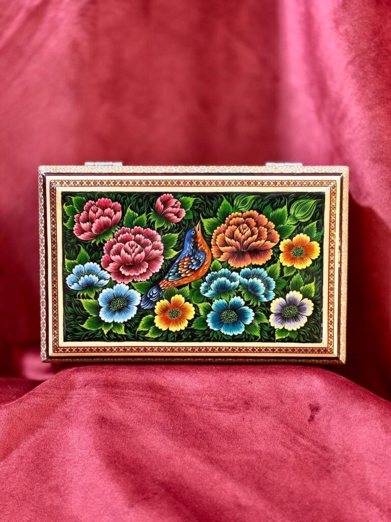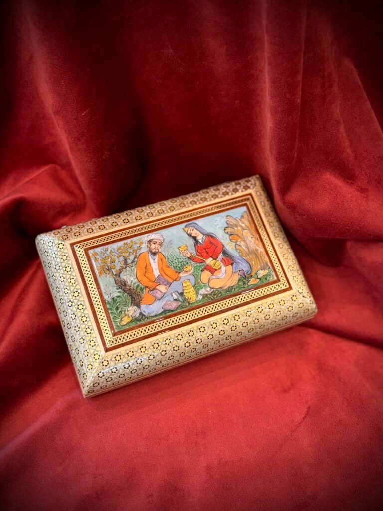 جعبه جواهر خاتم و نقاشی گل و مرغ پردازی داخل خاتم