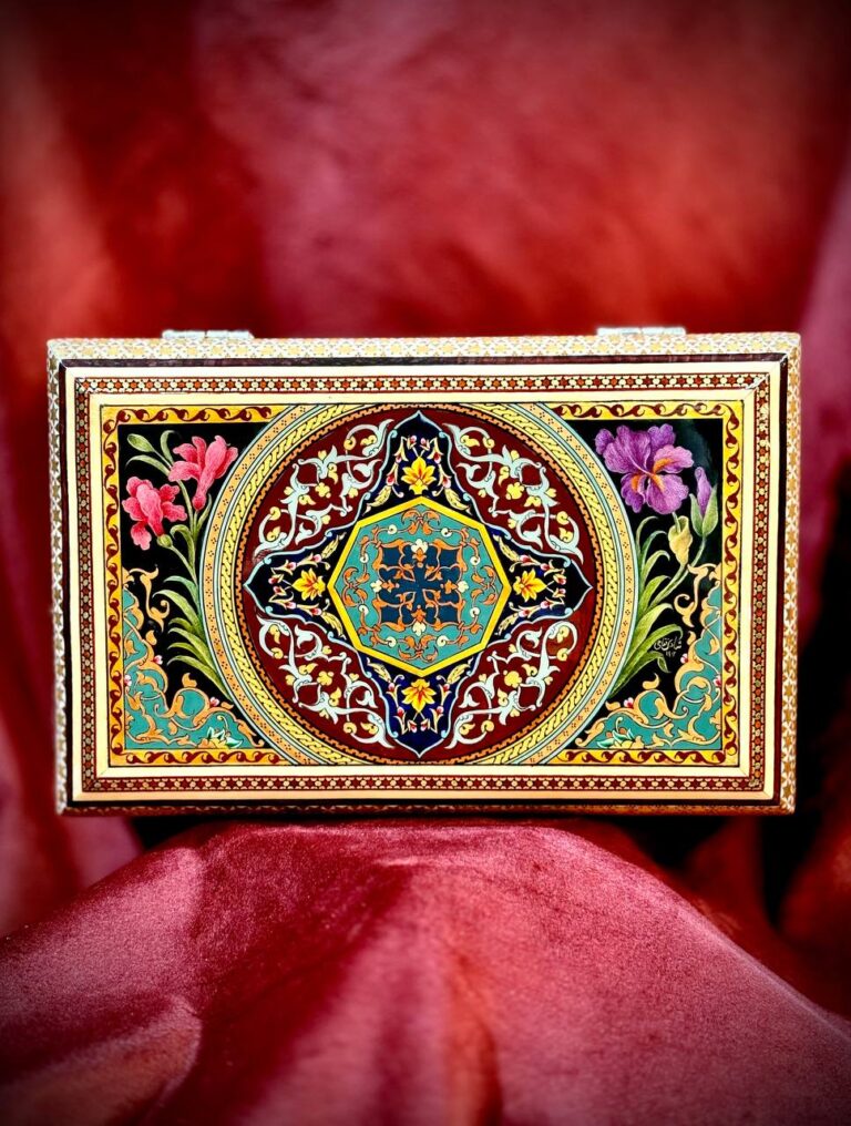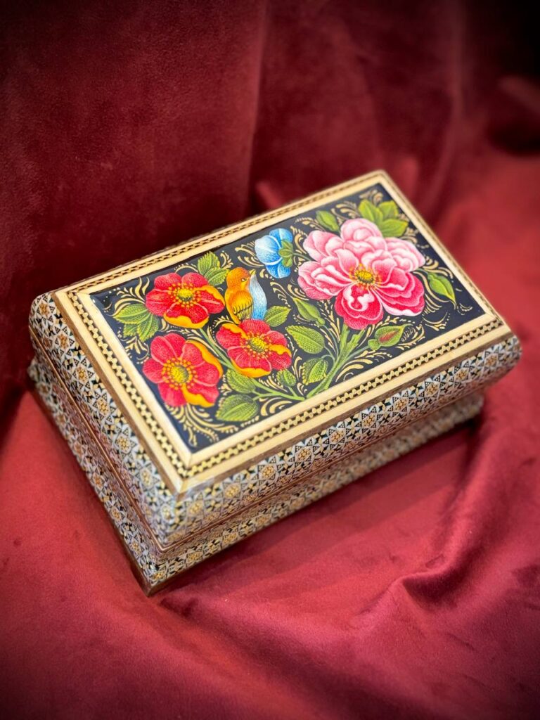 جعبه جواهر خاتم و نقاشی گل و مرغ پردازی داخل خاتم
