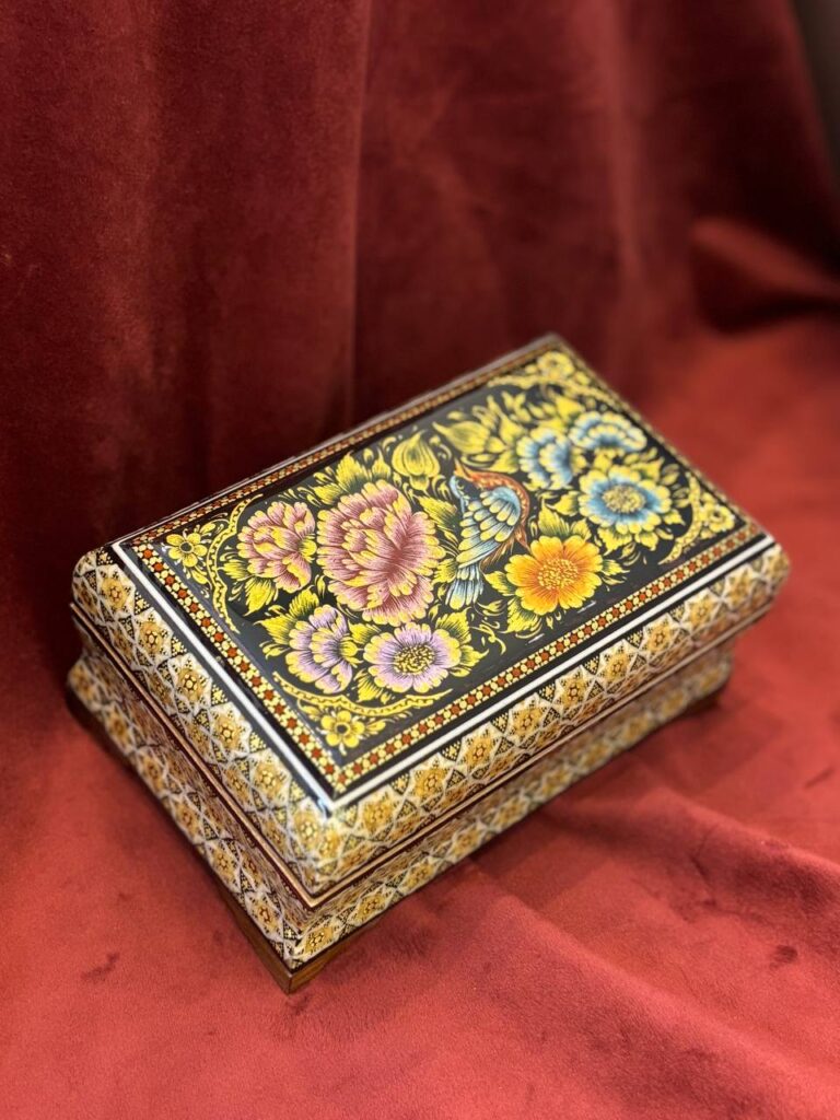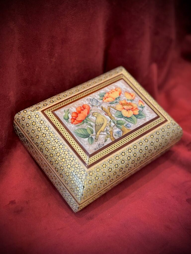جعبه جواهر خاتم و نقاشی گل و مرغ پردازی داخل خاتم